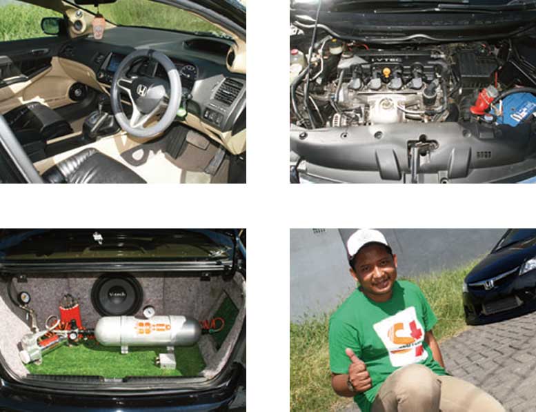 Langkah modif tak hanya sampai disitu saja, berlanjut ke aplikasi body kit bertema elegan, hasil garapan Bags 32 Autohaus, Surabaya. Pada bumper depan dilengkapi air dam, sebagai penunjang siklus udara untuk konsumsi intercooler yang dipinang dari Apexi. Menekan ground clearence tampil lebih rendah turut direalisasi lewat pemakaian spoiler pada bumper depan.