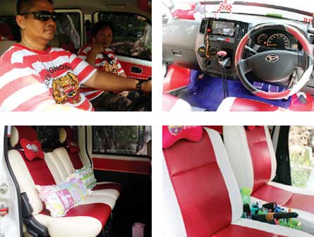 Wajah mobil berkode mesin DF35 nampak ngejreng setelah beberapa bagiannya disentuh cutting stciker jenis kiwalid. Makin terang dikala perjalanan malam setelah bagian atap tertata lampu sorot berikut bumper depan terpasang DRL (Daytime Running Lamp). ”Untuk headlamp kupake HID sedangkan tanduk depannya kupasang milik Alphard,” sahutnya.