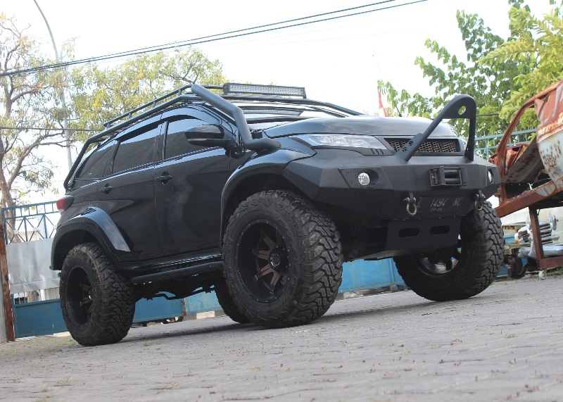 Penampilan kian kekar setelah per shockbeker depan belakang meruju custom. "Sedangkan untuk per kupake tinggi 20 cm depan dan 15 cm belakang," bisik kho Andre. Makin jangkung dudukan per belakang diganjal plat besi setebal 2 cm. Supaya velg HSR Kanigoro berdimensi 20x12 dibalut kuartet ban Accelera MT01 dengan ukuran 37x13,5/R20 kian serasi maka sudut pir shockbeker disesuaikan ulang. "Soknya pakai Profender sedangkan lengan ayun masih bawaan mobil," tutup crew Alert (All New Rush Terios) regional Jawa Timur itu.
