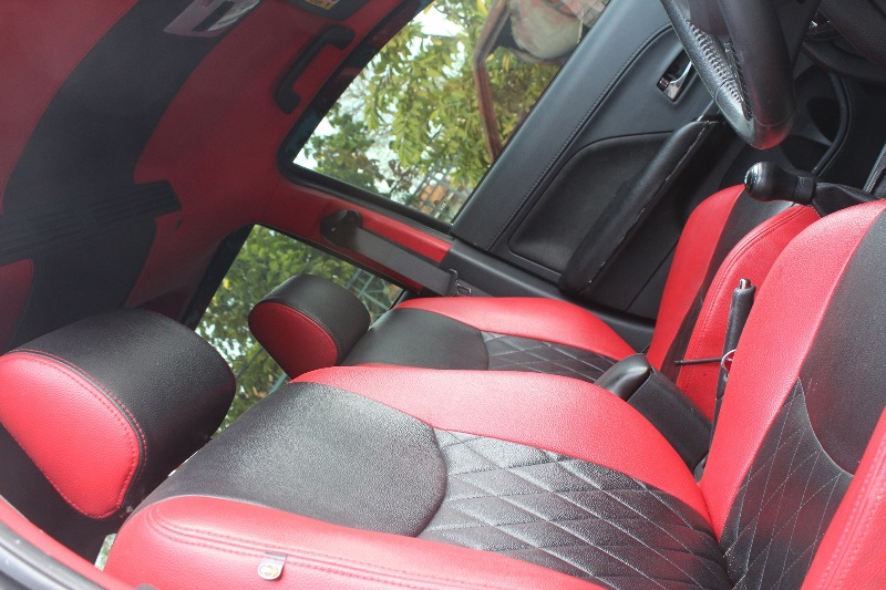 Sepintas raut kabin tak banyak perubahan mencolok. Jok dudukan, plafon serta doortrim dibalut vinyl MB Tech merah hitam. Makin sporty setelah lis kemudi dan dashboard merujuk karbon Kevlar. "Untuk kabin kupercayakan desainer rumahan sedangkan karbon Kevlar masih karya kho Andre," ujar Reinaldi Sangga Susilo.