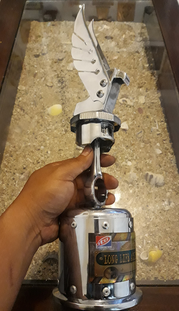 “Trophy spesial ini dikreasi sendiri oleh sang Monster 5% Ototrend untuk dipersembahkan kepada seluruh pejuang persaudaraan Modificator Jabar Bersatu yang selama ini setia belajar, berjuang dan berprestasi bersama Ototrend. Dibuat dari rangkaian bahan part motor, diantaranya spion Honda C-70, pipa alumunium silencer knalpot racing berikut tutup moncongnya, stang dan piston Honda Vario over size nol serta tutup tangki Honda CB100 K-5. Sementara itu ornamen atas berupa patung elang 3D direplika dari simbol mobil Avions Voisin, produk mobil mewah legendaris Perancis era 1919. Finishingnya, kesemua bahan metal trophy ini dilapis kilau krom karya Bhumi Ayu Chrome & Polish Malang dan disempurnakan plakat sticker hologram lapis resin katalis bertema baja abadi karya Caesar Sticker Sampang Madura,” papar Yuni Monster 5%.