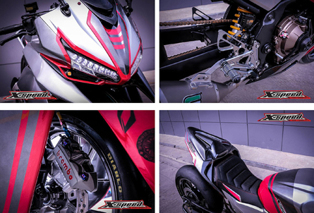 Bukan gerai variasi dan modifikasi X-Speed namanya jika tidak berulah unik dan beda. Gerai dari negri gajah putih ini menjahili Honda CBR500R baru versi 2016 yang dikonsep Superbike GP Drag Sport Advance. Cus dikhususkan untuk arena lurus lempeng, disengaja dipakai rombakan fairing yang sangat unik. Fairing samping kiri kanan ini dibuat memeluk roda depan yang akibatnya jarak main setang jadi terbatas, dibentuk tajam dan makin semirip motor tokoh kartun manga.