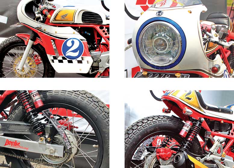 Didepannya, nangkring custom fuell tank, berikut set fairing classic yang menyambung ke bagian kedok headlampnya. Selain diperkuat suguhan kemudi jepit variasi, serta kelengkapan handgrip DBS berhandle IGW, aura balap tempo dulu nggak lupa ikut ditampilkan doi bareng semburan cat Blinken disejujur uniform plat customnya.