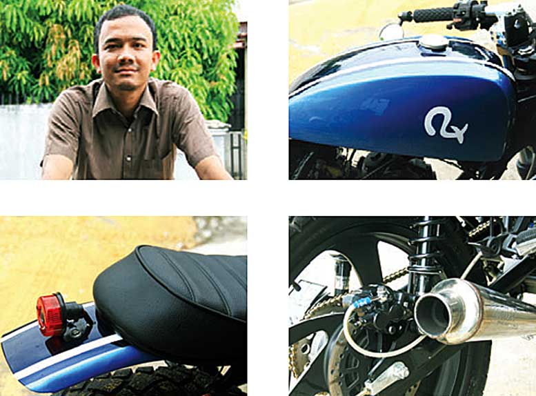 "Awalnya bodi standart namun kupikirpikir kurang ganteng ya. Di situlah kubikin aliran retro garapan Nganjuk Custom Pekanbaru yang tentunya memulainya dari nol. Untuk cat, logonya ksatria Baja Hitam idolaku sedari dulu," papar Samuel.