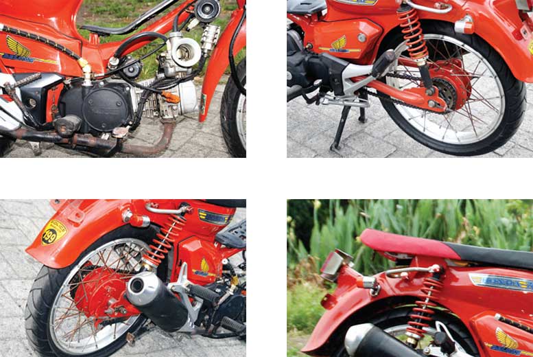 Pertimbangan intensitas kegiatan riding yang tinggi, kolektor nopol W4605 itu turut menyempurnakan kaki-kaki. Sok depan berganti Supra 125, komplit segitiga. Dan lengan ayun custom, mengusung pipa SKD 25 mm.
