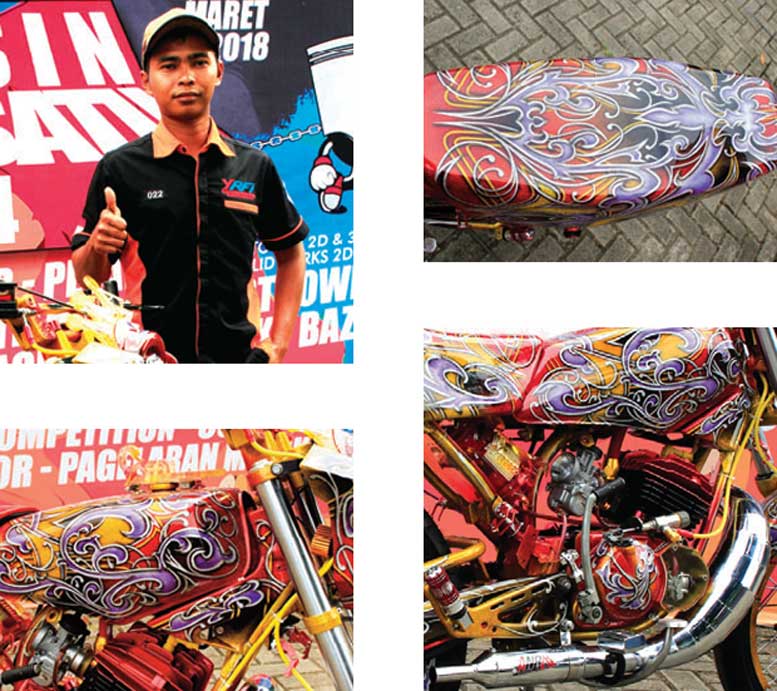 “Selain jadi gengsi tersendiri, tampil beda jadi alasan mutlak gua mas,” tutup cowok asli Kebumen tersebut. Bareng warna dasar gold and merah yang ditumpahkan dari spray gun brusher berstudio VIP Custom frim Yogyakarta, rangka RX King bersurat 1999 mulai diremajakan bercampur gliter.