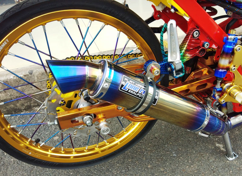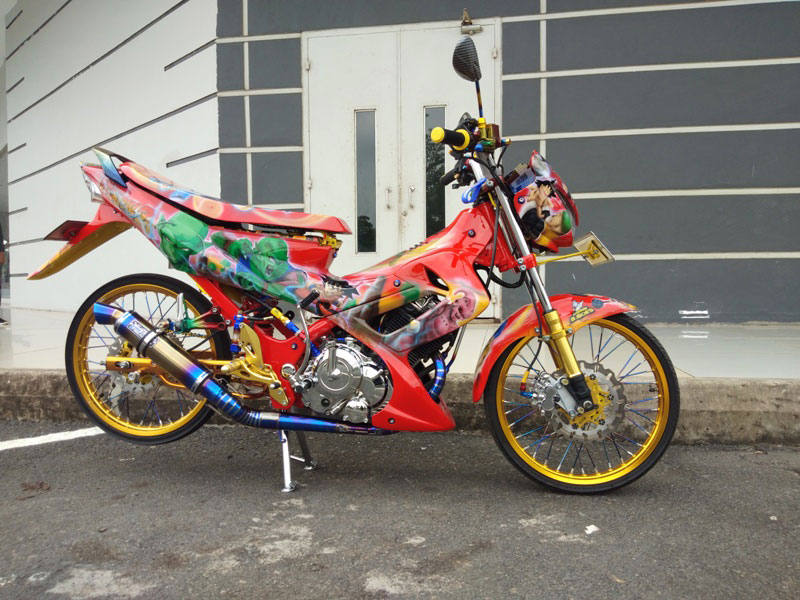 SOK DEPAN - BELAKANG : Scarlet / YSS , MASTER 8 KALIPER : Stock, TROMOL : 2ox, SWINGARM : Bpro, PELEK : Comet 1.40 & 1.60 ring 17, BAN DEPAN - BELAKANG : Corsa 50/90 & Mizzle Hydra, ENGINE : Korek harian, KARBU : PE28, CDI : BRT, KOIL : YZ125, KNALPOT : Lone Rider, PIJAKAN KAKI : DKT, GAS SPONTAN : YZ125, TACHO & GAUGE : Indiglow, EPOXY - CAT & CLEAR : Nippe - Danagloss / Sikkens, BRUSHER : Bagoes Airbrush - Perum Ricci 2 Blok F1 no.9 Batam CP : 0812-7600-6077, MODIFIKATOR : FU 150 Rider Batam CP : 0853-6591-6951.