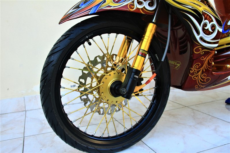 Sembari mengerjakan sisi body part, modifikasi yang butuh waktu sekitar empat bulan ini juga menyasar kaki-kaki. Sektor ini, diperkuat sok depan belakang Combiz dan YSS berulir merah yang ditopang oleh tromol berkelir gold serta rajutan jeruji TDR gold. Sedangkan lingkaran peleknya pun memakai pelek hitam berlabel Comet 140-17 dengan balutan ban hitam berprofil FDR Genzi 70/80-17 & 80/80-17.