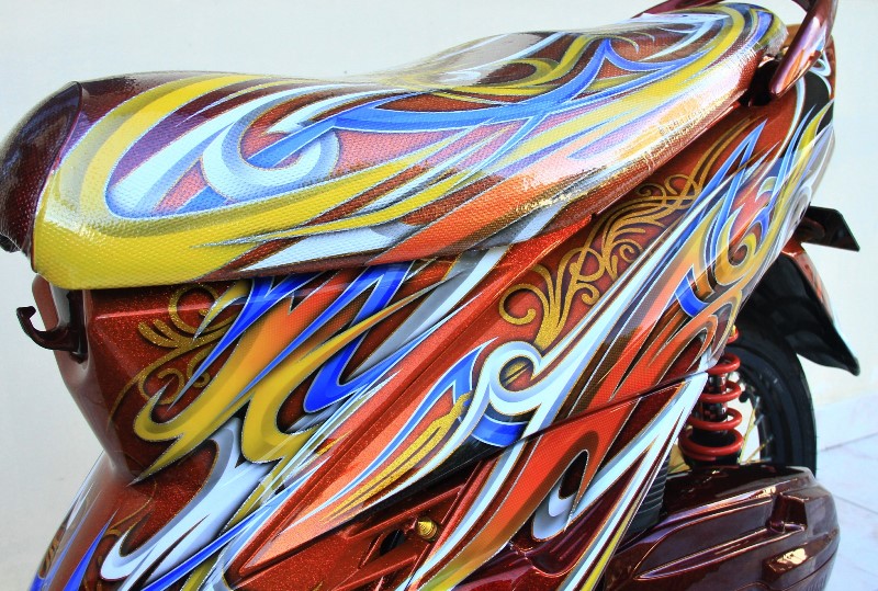 "Untuk saluran hobi, tak ada salahnya bikin media di bodi motor dengan airbrush, karena aku juga seni sih," ucapnya. Sembari menggandeng brusher berlabel D7 Paint Jayapura, Evi memilih grafis klasik floral sebagai konsep dasar airbrush di skutiknya. Semuanya, dari basis bahan Penta dan Spieshecker sebagai finishingnya.