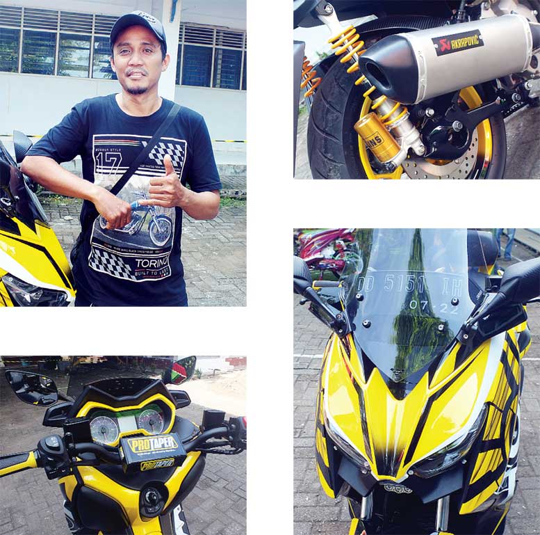DISC : TDR, MASTER-KALIPER : Nissin, SOK BLK : Ohlins, BAN : Dunlop, KNALPOT : Akrapovic, WIN SHIELD : Geba, BACK REST : X Max 300, SETANG : Pro Taper, SPION : YZF R25, BRUSHER : Hen’s Airbrush, Jl.Poros, Maros-Makassar, MODIFIKATOR : Uphy Modified, Jl. Sepakat No.29, Makassar, OWNER : Imran (08124005151)