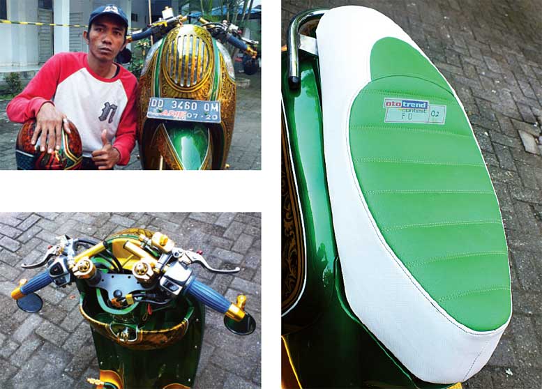 BOTTOM : Seven Speed, DISC : Sun Star, HANDLE : KTC, PELEK : Monoblock 12”, BAN : Michelin 120/70 & 130/70-12, KNALPOT : Japs, SETANG : Igawa, FILTER : Mutaru, MODIFIKATOR : Roemahkoe Airbrush/A3 Maticshop, Tangkuru, Maros-Makassar (081244840554).