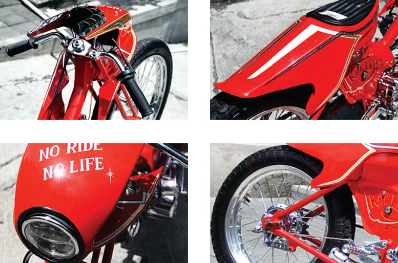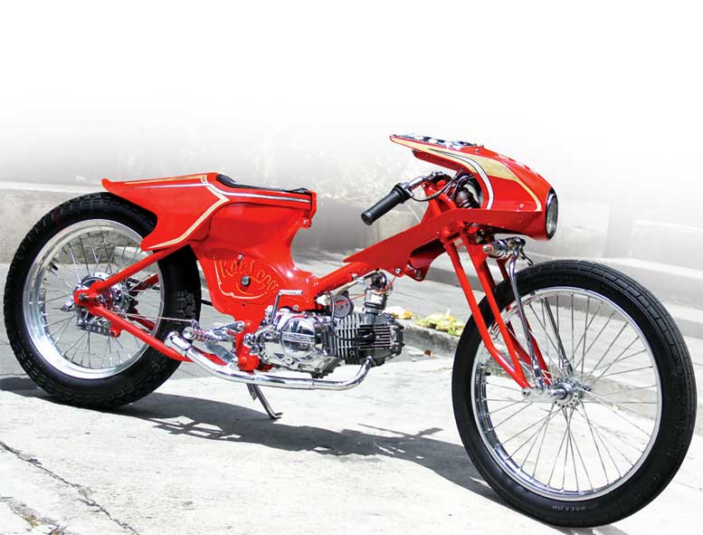 “Lahir dari kejenuhan trend style choppy cub yang monoton, hingga kurealisasi unik berbenang merah bebek racing jalanan klasik kombinasi European dan Japanese look,” lugas doi.