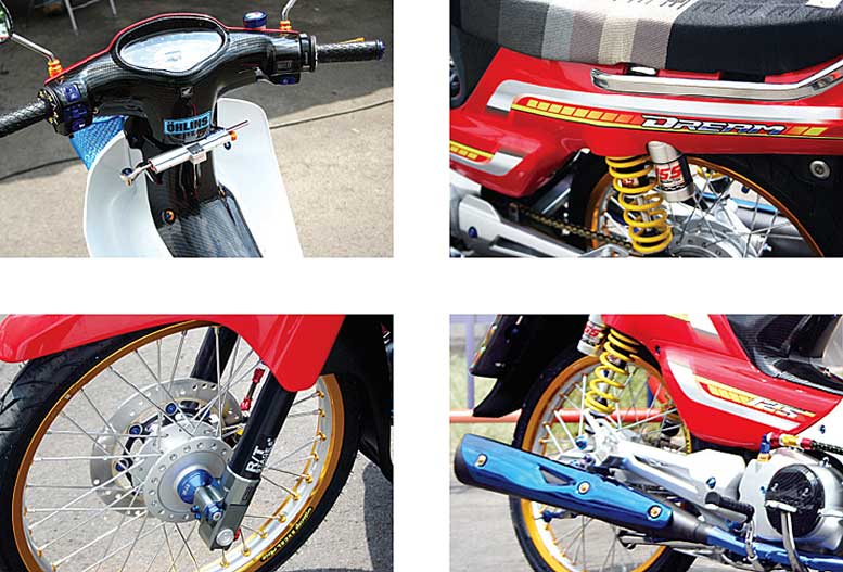 Tak perlu memainkan over warna yang bikin puyeng sang builder, karena hanya cukup membalutkan warna merah Ferrari di sekujur set body sudah cukup mewakili aliran yang diusungnya. Apalagi diperkuat dengan sayap putih plus sticker printing bergaya minimalis namun nuansa Negeri Gajah putihnya begitu kuat. Dan tak lupa ditambahkan karbon kevlar pada dek tengah dan back batok depan.
