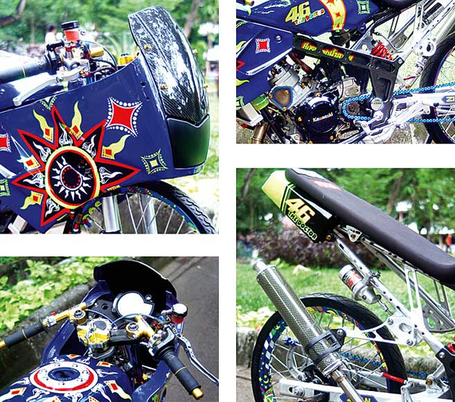 SOK DPN : Suzuki Satria FU. CAKRAM DPN/BLK : Brembo. KALIPER DPN/BLK : Brembo. TROMOL DPN/BLK : Kawasaki KZ. SWINGARM : B-pro. PELEK DPN/BLK : D Max. BAN DPN/BLK : V Rossi. FOOTSTEP : B-Pro STANG : B-Pro. HEADLAMP : HID Projie. CAT : Danagloss. BENGKEL MODIF : Tockcer Modified (TIM Panik) - Cengkareng, Jakarta Barat 089664020003.