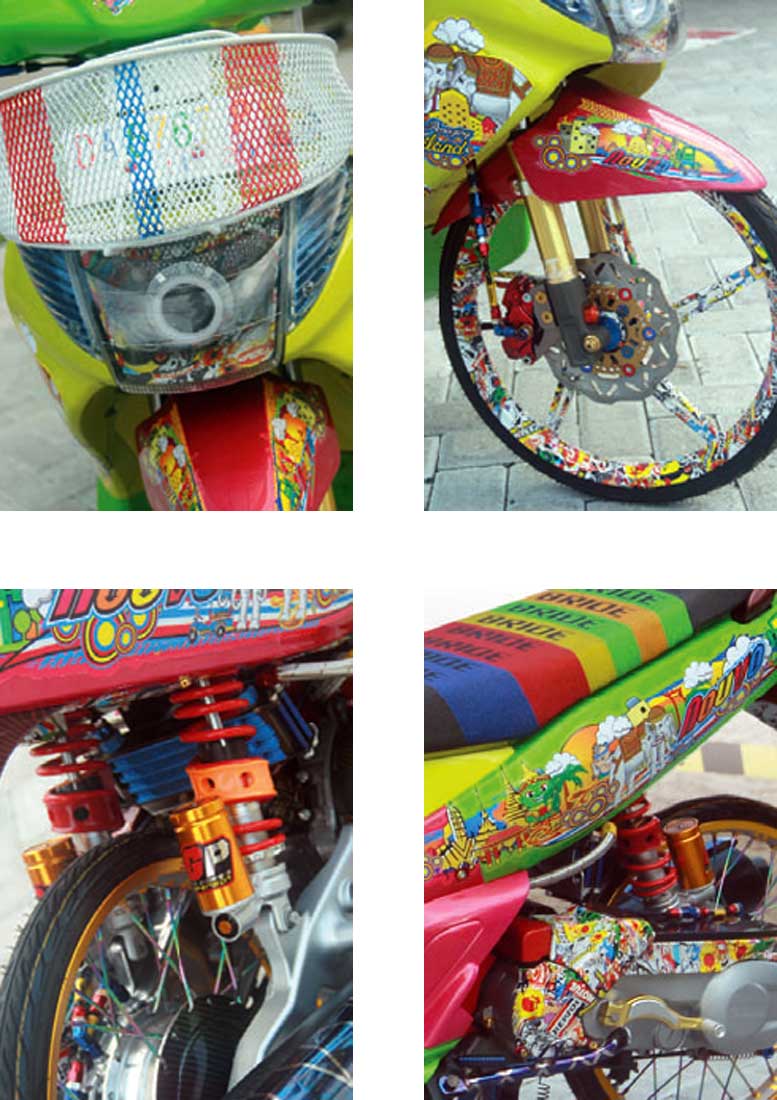 "Perbagian body kubungkus kelir berbeda. Nah finishing juga kutambah striping ala Thailand yang didesain ulang dengan kemasan kreatif ala modilover Indo," tambahnya. Lanjut aksi, aseso juga nggak kalah.