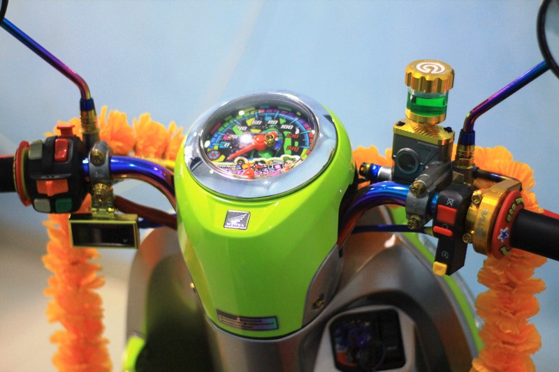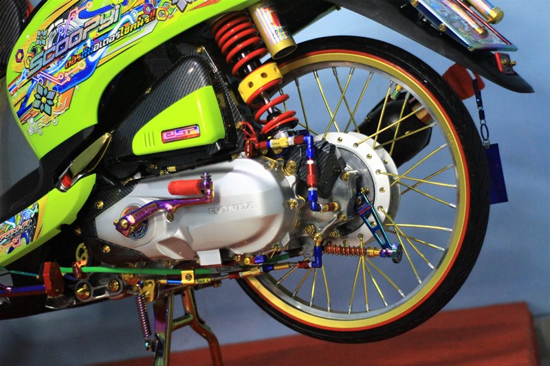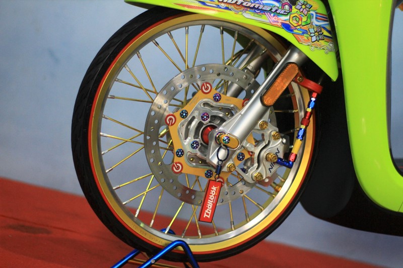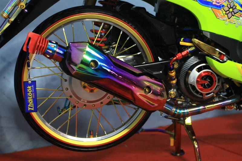 Dibantu dengan para crewnya, Yusuf menjejalkan banyak trend thailook terkini, biar pakemnya kian clear dan nyata. Ubahan pertama, sentuhan kaki-kaki yang memainkan pelek berprofil Akront dibalut ban hitam Duro dengan jeruji TDR gold. Sedangkan untuk sisi pengereman pun ada perubahan pada area depan dengan piringan cakram Nissin lengkap dengan kaliper Nissin 2 piston.