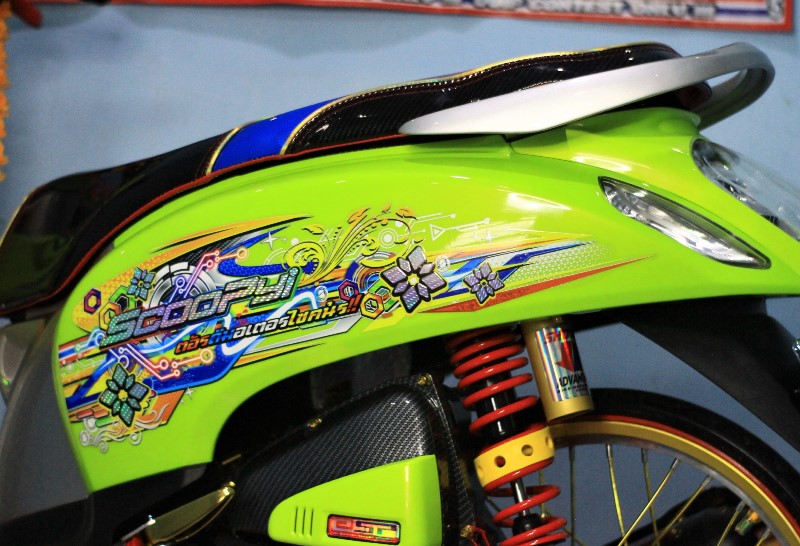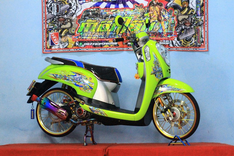 "Dulu sempat doyan balap, kini sibuk usaha dan urus keluarganya. Jadi, hobi motornya ke modifikasi saja. Aku ubah Scoopy ini juga buat maskot toko," tutur owner dari Montok Matic Shop tersebut.