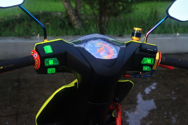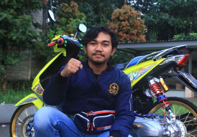 Mengakhiri modifikasi tampilan luar, untuk kemudi stang sedikit perubahan dengan memainkan handgrip Ariete dengan gas spontan Active bersaklar hijau yang semakin bewarna. Untuk spionnya pun memilih batang spion rainbow. "Meski menghabiskan budget yang tidak sedikit, namun ubahan motor aku ini membuat aku bangga. Dan bisa juga buat transportasi pegangan harian," tutup Aming.