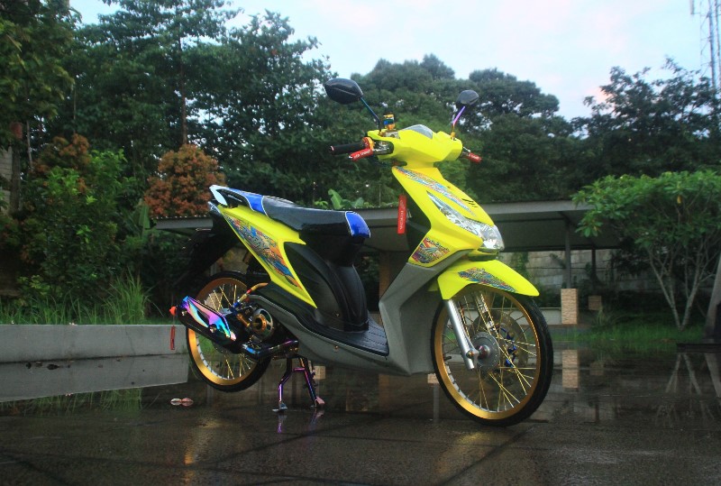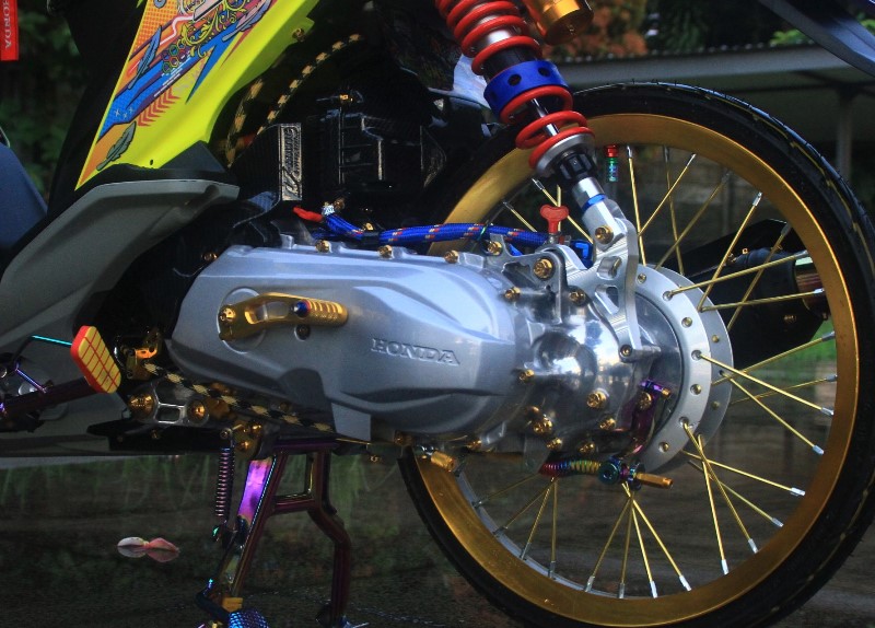 PELEK DPN & BLK : Zipp 140-17, BAN DPN & BLK : Duro 45/90-17 & Duro 50/90-17, SOKBREKER BLK : Kojima, CAKRAM DPN : Fastbike, KALIPER : Brembo, SELANG REM : Swith, KNALPOT : KOU, KICK STATER : Driv, HEADLAMP : LED, CAT & CLEAR : Sikken & Cargloss, GAS SPONTAN : Active, SPION : Variasi, JOK : Bikers, STRIPING : GNS Printing, BENGKEL & BRUSHER : GNS Matic Shop (087727735228) ft Vanz Modified & AR Painting Bogor, PEMILIK : Aming (089636097985)