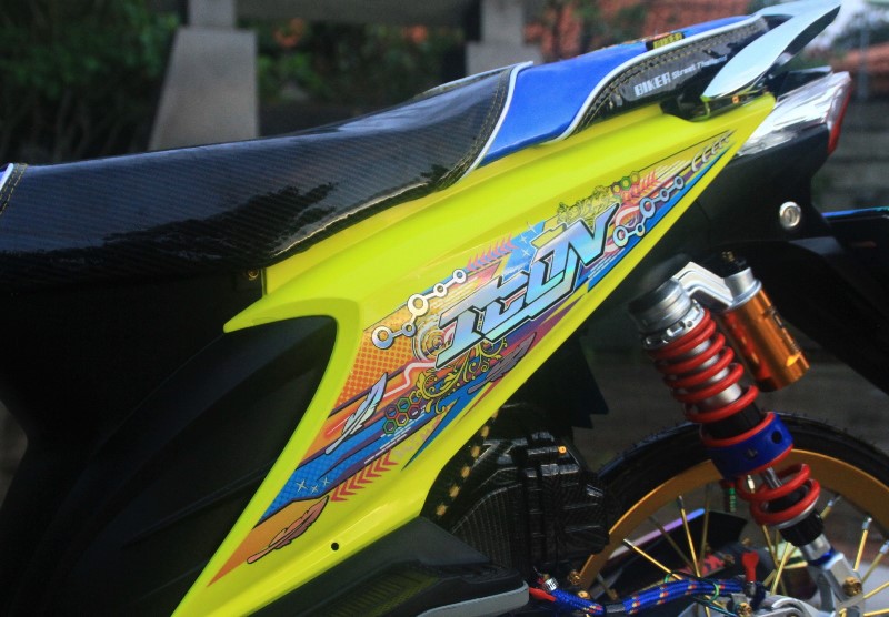 Agar terlihat lebih menarik, bodi luar diguyur ulang painting, dari oplosan cat Sikkens berclear pernis Cargloss dari sang tangan brusher AR Painting from Bogor. Untuk area stripingnya tetap mengikuti trend masa kini dengan striping custom berbahan glossy karya GNS Striping. Area jok di desain lebih tipis bermodel Xride dengan jok bermotif carbon versus biru dengan lis hologram yang semakin detail jahitan kuning.