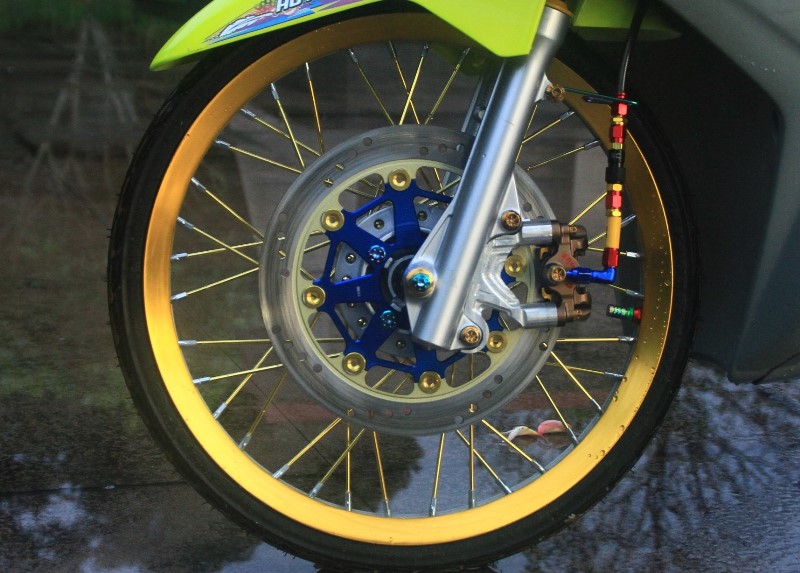 Ubahan yang dilakukan Aming lebih mengarah ke bolt on, terlihat pada sisi sektor kaki-kaki yang diupdate dengan variasi terbaru, seperti pelek gold twotone Zipp berjeruji TDR yang menopang tromol pabrikan berkelir silver yang semakin kece oleh suspensi belakang Kojima berulir merah.
