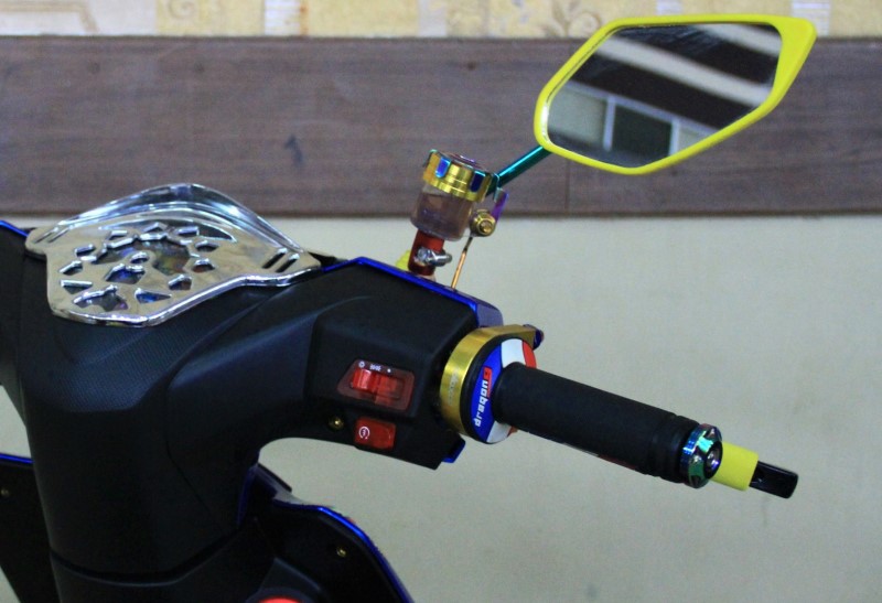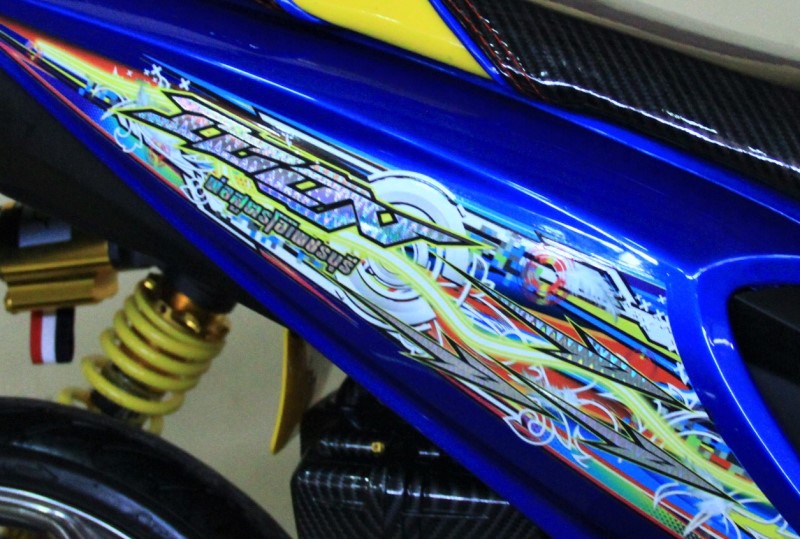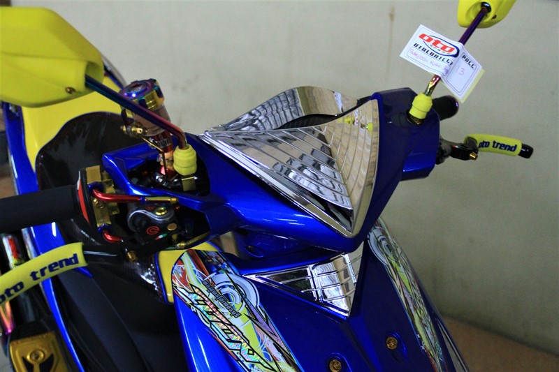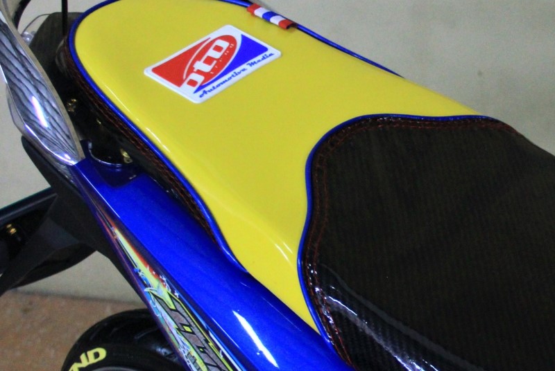 Khusus aseso dan detailing, dimantabkan dengan penggantian jok tipis bersarung jok biker bermotif twotone xride dengan warna kuning versus hitam carbon yang semakin detail lis birunya. Sedangkan kemudi stangnya sedikit mengubah lebih simple dengan saklar variasi berhandgrip Dragon9 bercorak hitam lengkap master rem Brembo ditemani 2 buah spion variasi kuning. "Bangga dan puas untuk motor modif aku kali ini yang dikerjakan oleh bengkel Ard’s Custom ini. Next aku bisa mencoba modif lebih maksimal lagi,” tutup putra.