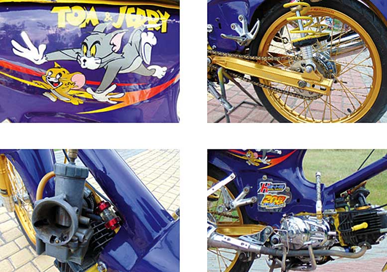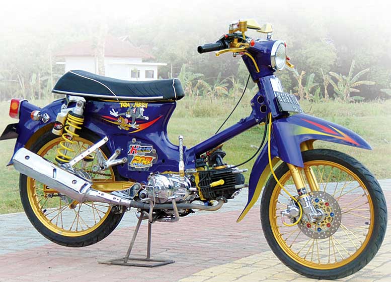 ”Untuk kedua lingkar roda, kupasangi pelek almu kelir gold menjarah milik Comet yang kubalut karet pengaspal Mizzle,” tunjuk doi. Makin tampil modis, pada bottom doi pilari produk aftermarket mengadopsi Seven Speed berkelir gold pula.
