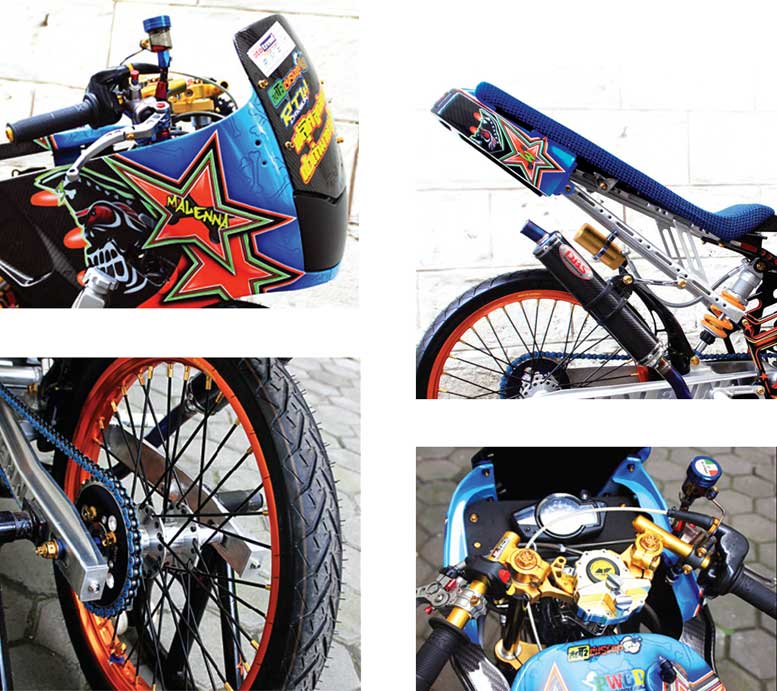 BODIWORK : SSR, STANG : K-Tech, TAKOMETER : Koso, STABILIZER : Ohlins, GAS SPONTAN : Domino, TANGKI : DKT, RADIATOR : NSR, PELEK : Kingu, BAN : Eat My Dust, TROMOL : DKT, DISC : Braketech, KALIPER : KTC, LENGAN AYUN : K-Tech, KNALPOT : DBS, MODIFIKATOR : ADT2 Custom, Jl. H. Nawi RT 05-Bekasi (082298665686).