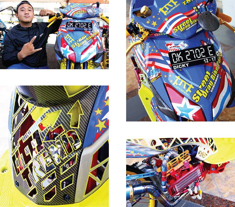 Dikonsep kental bernuansa NGO Street Drag Bike Party, beragam teknik modif dijabaninya. Tengok tuh all uniform body orsinya, sudah tak utuh lagi berkat hujaman beragam motif coakan di area sub body-nya, dari back deck, under seat cover, serta side cover area.