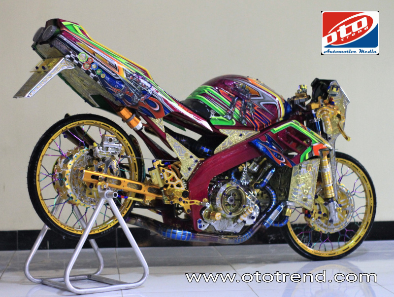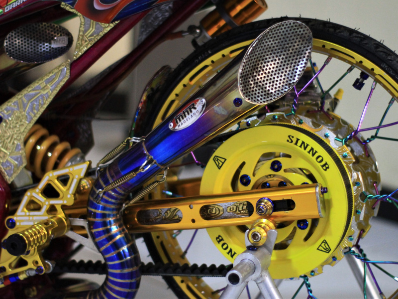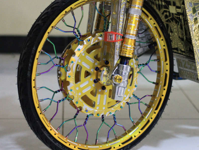 Gerai modif rujukan Otre ini pun mengerjakan perubahan yang signifikan, diawali sektor kaki-kaki yang mengusung pelek Willwood 140-17 warna gold di topang tromol custom lengkap jeruji pelintir dari V1 Rainbow.