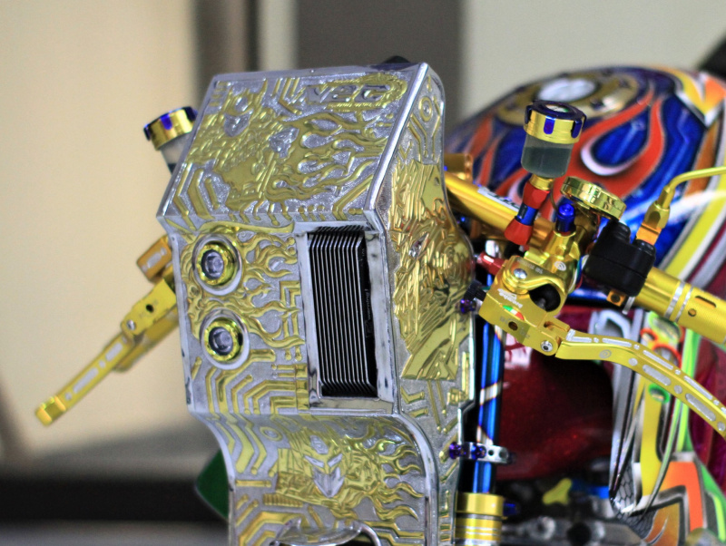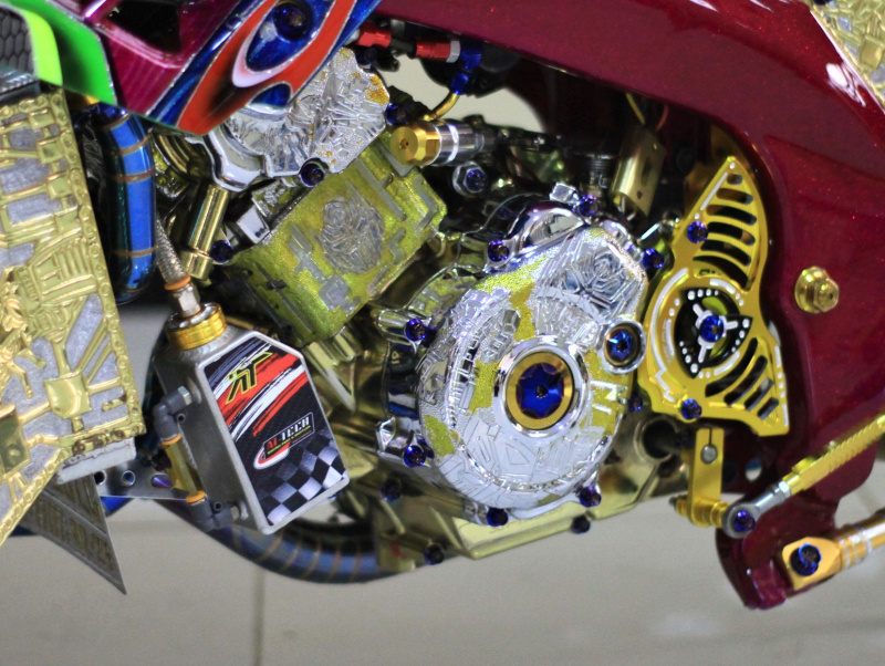 Sebagai finishing, Nuki yang dibantu oleh beberapa crewnya pun semakin maksimal dan detail pada bagian cover engine dan cover radiator dengan balutan ukiran grafir gold di imbangin nuansa chrome.