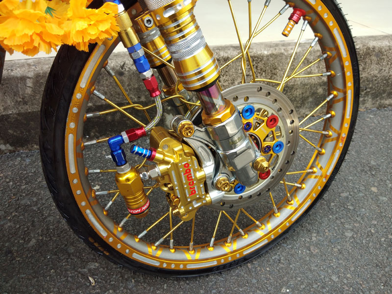 Meningkatkan peredaman sekaligus menambah aura racing di sisi kaki-kaki, gerai yang bermarkas di Legenda Point Batam ini mengandalkan sok depan model custom up side down, yang sudah bubutan ulang, lengkap dengan satu paket disc brake Fast bike, yang dijepit master kaliper KTC/Brembo. Semakin lengkap, sisi depan juga ditutup spatbor mungil. "Untuk roda-roda, kita pasang spek kecil sih. Cukup pelek DFT dengan ban Duro 50/65," tambah aplikator ruji plintir ini.