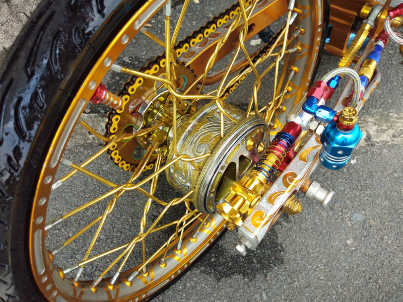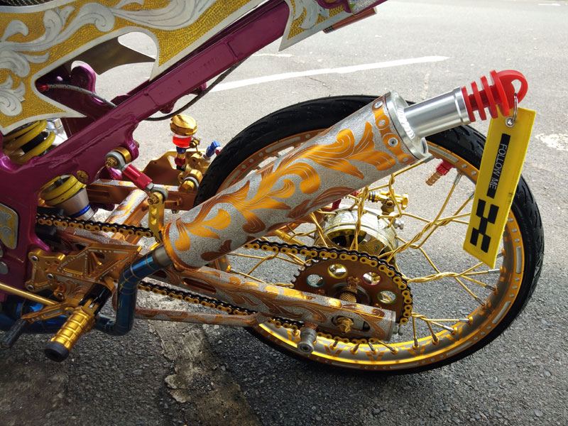 Di belakang, ayunan swingarm B-Prodengan monosok YSS repaint kuning juga sanggup meningkatkan bound-rebound. Dan pastinya, pas dengan pakem street racing kekinian, yang mana sekujur bilah armnya sudah digrafir terlebih dulu, agar komplit dengan bagian-bagian lain yang juga diukir, termasuk tromolnya.