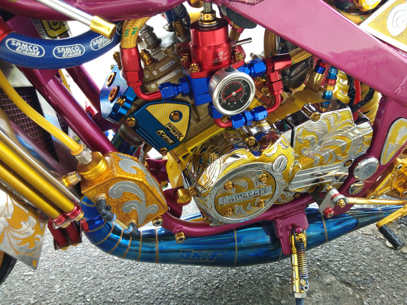 Enginenya sendiri dispek untuk korekan harian, jadi cukup dengan penambahan part racing seperti kopling hidrolis, oil cooler FU custom hingga FPR dan cover berikut baut asesorisnya. Sementara, sisi luar mesin termasuk kalter kiri dan kanan ikutan digrafir dengan berlatar warna gold-chrome.