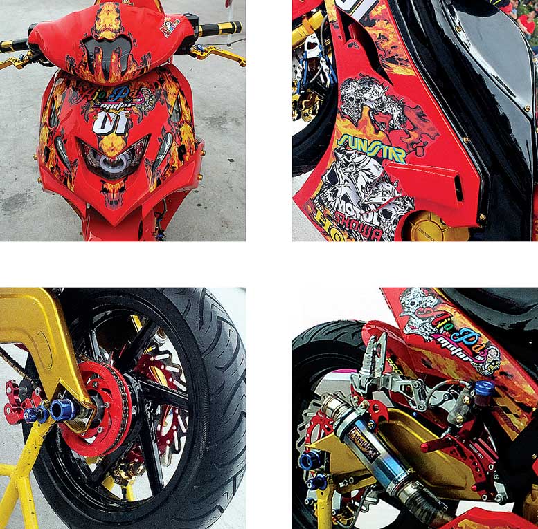 Semua dibuat rapih, tanpa menemui kendala, mengingat hasil garapan Ajo sudah mengalami proses riset terlebih dahulu tanpa mengganggu frame orsi yang tetap difungsikan. Makin ajib saat warna merah bertandem custom sticker bertema tengkorak guna mewakili image jantan yang dimau.