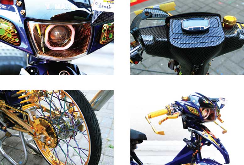 Hal itu tidak lepas dari kombinasi sektor kaki-kaki dan mesin yang resik, yaitu sepasang pelek Zero Gold yang tampak cingkrang ketka digandeng ban ceking berlabel Duro. Sedangkan untuk tromol, Deni menganut jenis custom yang telah digrafir sebelumnya.