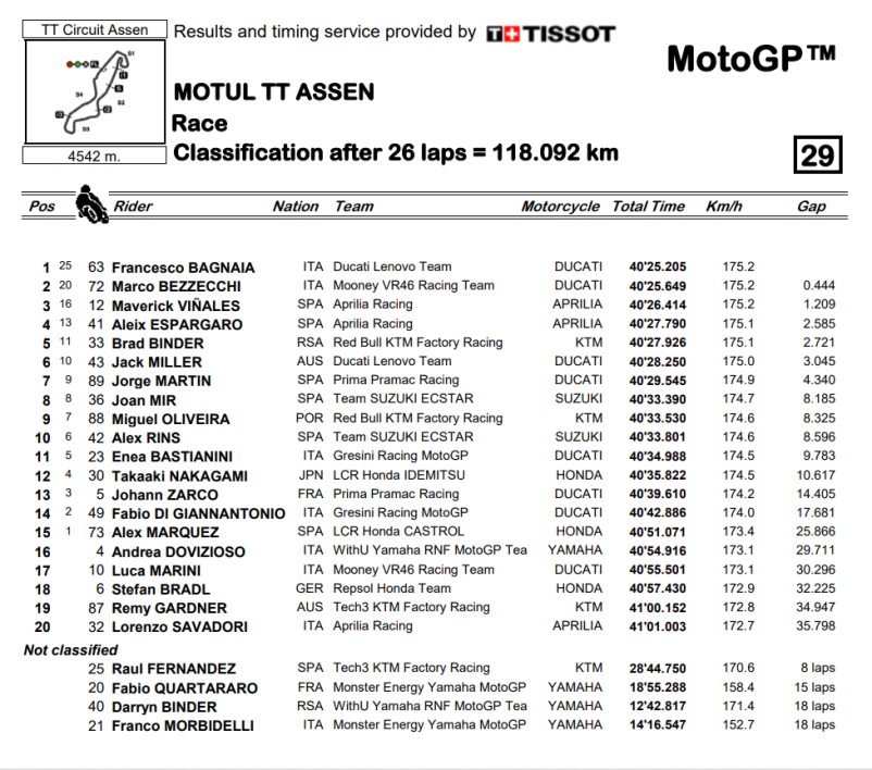 Termasuk, mengovertake dua pembalap sekaligus, Brad Binder dan Jack Miller, di chicane terakhir jelang finish. Sementara, Quantararo akhirnya DNF setelah kembali terjatuh, yang kemudian malah mendapatkan sanksi berupa Long Lap Pinalty di seri selanjutnya, yakni di GP Inggris.